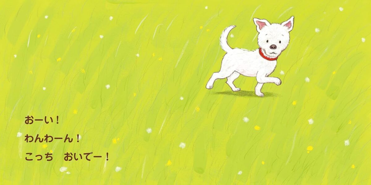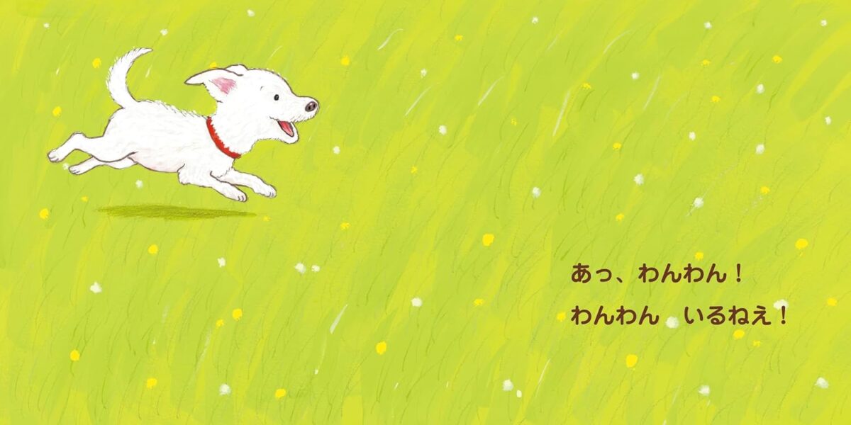 あっ、わんわん! おーい わんわーん! こっち おいでー! あっ きた! きた! あれ? わんわん どこ いった? いない いない! 「ばあ!」