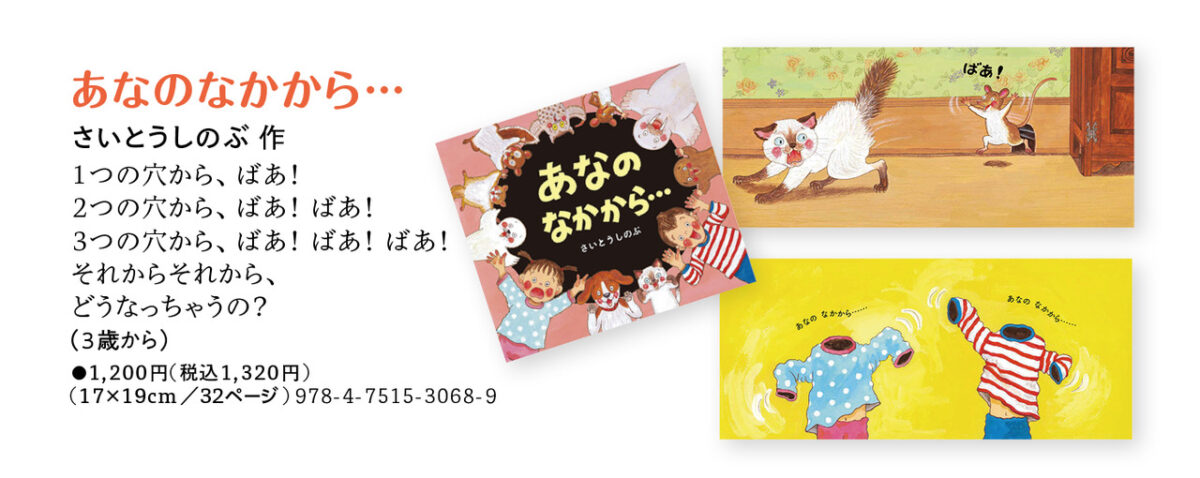 「いないいないばあ」と「びっくり箱」がひとつになった楽しい絵本です。穴の中から何が飛び出すのか、ページをめくるまでわかりません。予想のつかない意外なものの登場に、赤ちゃんも大人も思わず笑っちゃう、ユニークな絵本です。