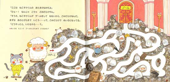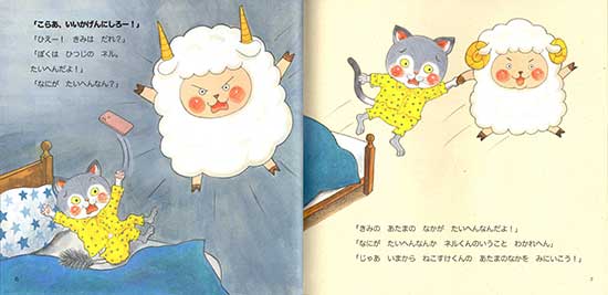 いつもは早寝早起きのねこすけくんですが、最近、布団にもぐって、こっそりゲームをすることも。そこに「こらぁ、いいかげんにしろー!」とあわられたのが、ひつじのネルくん。「たいへんだよ!」と言いながら、ねこすけくんを、ねこすけくんの頭の中につれていきます。ちゃんと寝ないねこすけくんの頭の中は、本当に大変なことになっていて…。