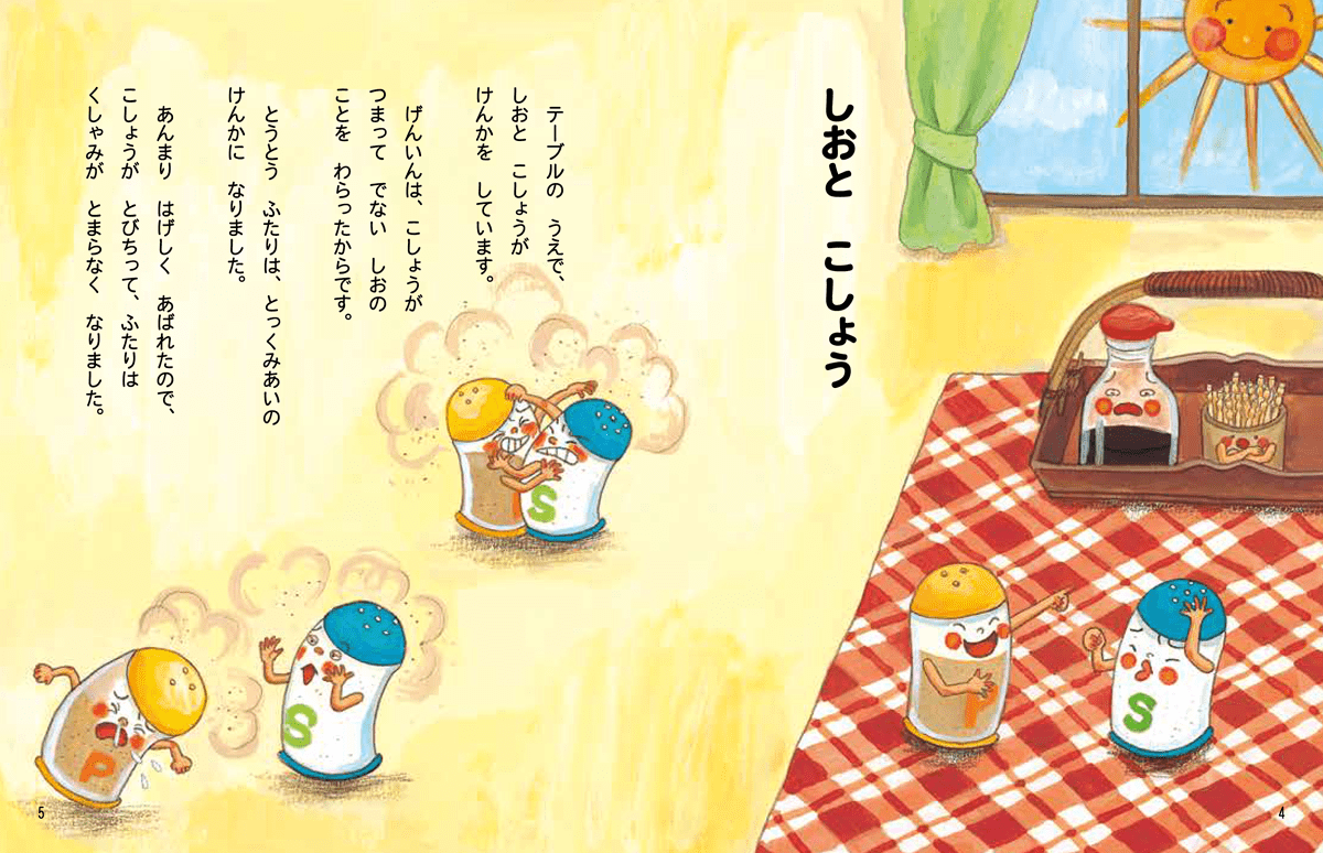 かつおぶし、しゃもじ、れいぞうこ、さといも、フライパン……。台所にある道具や食べ物たちがにぎやかに活躍する、愉快な一口童話集!