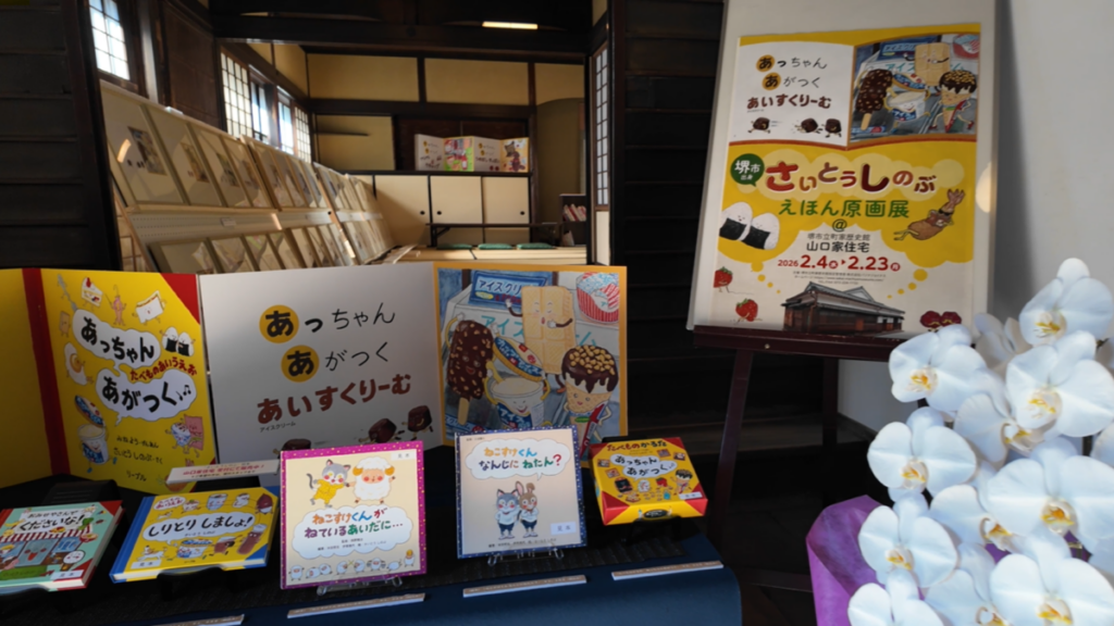 江戸時代初期の建築様式を残す、国指定重要文化財「山口家住宅」。 長い年月、堺の街を見守ってきたこの場所で、原画展を開催いたしました。 古い柱の質感や、畳を抜ける風。歴史の面影が残る空間に、色鮮やかな絵本の原画が並ぶとき、そこには現代の私たちが忘れかけている「豊かな時間」が流れていました。「紙の上に宿る、手描きのぬくもり」 印刷された絵本では見ることのできない、細やかな筆致や色の重なり。 山口家の落ち着いた空間の中で、一点一点の原画と対話するように鑑賞いただけます。 光の差し込む縁側で、あるいは趣ある奥座敷で。展示場所によって異なる表情を見せる作品たちをお楽しみ頂けました。